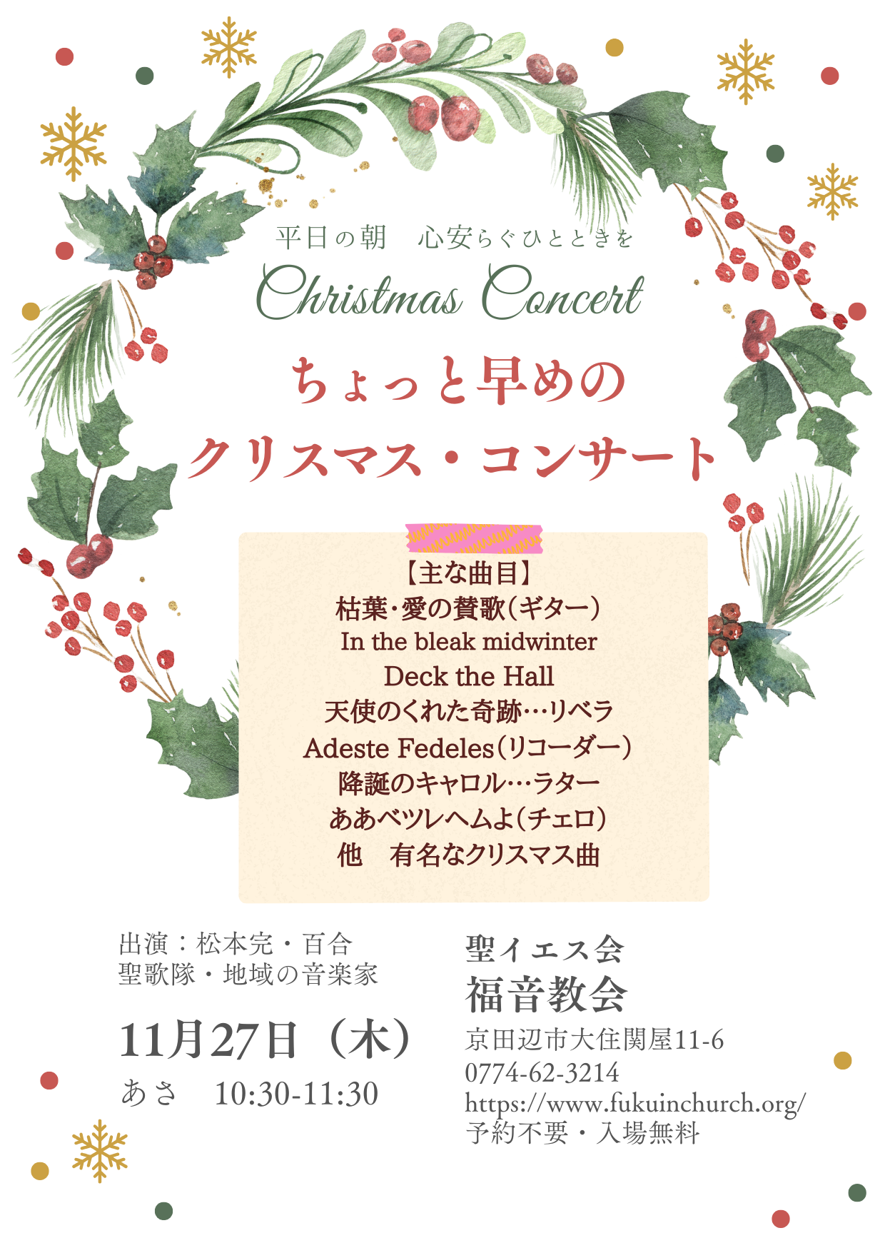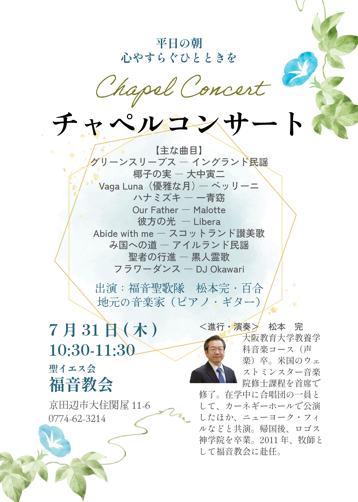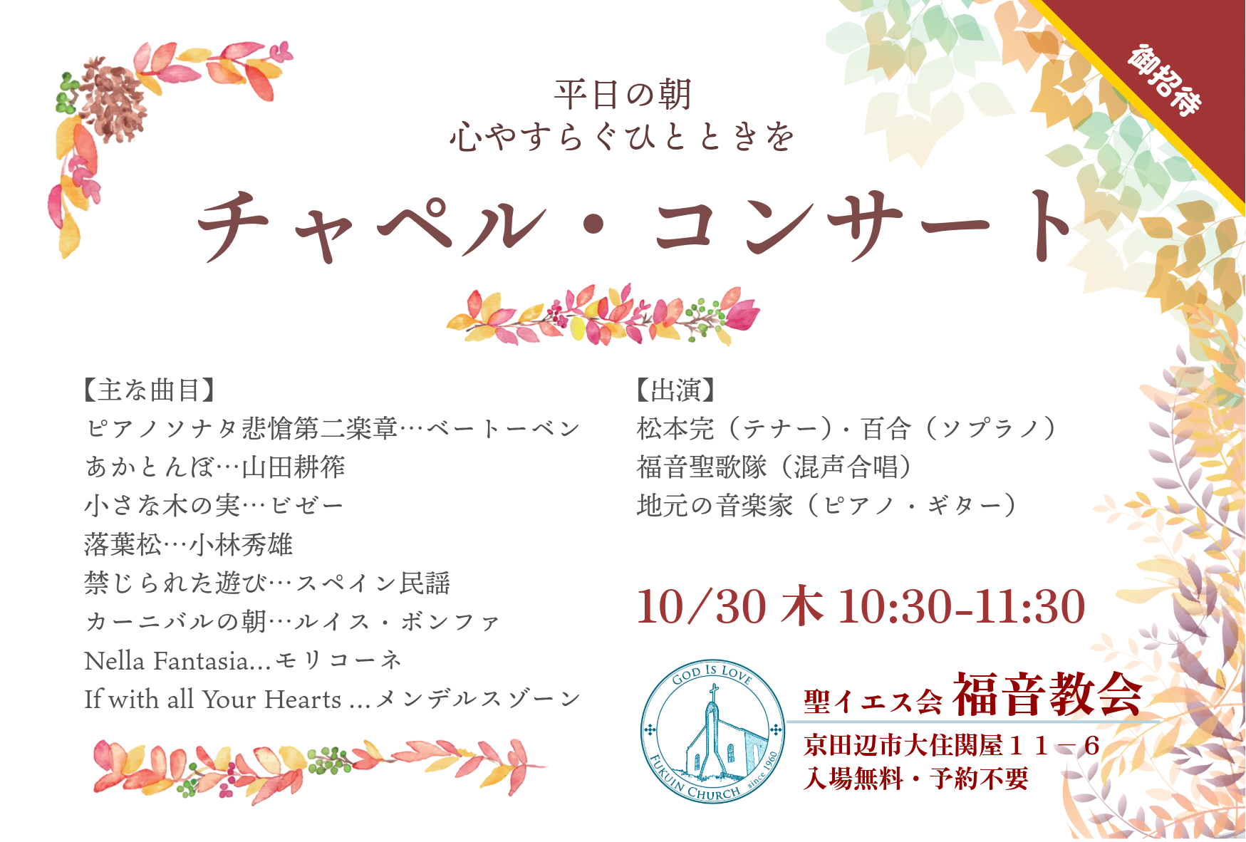 地域の皆様の心安らぐ場所として、平日の朝チャペルコンサートを開いています。どなたでもおいでになれます。気軽にお立ち寄りください。